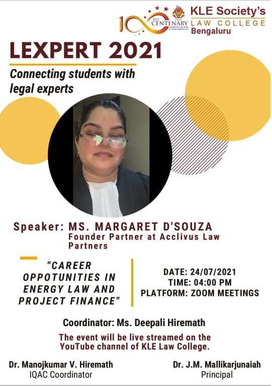 KLE Society’s Law College, Bengaluru, organises a LEXTER 2021 (Connecting Students with Legal Experts) session on “CAREER OPPORTUNITIES IN ENERGY LAW AND PROJECT FINANCE”